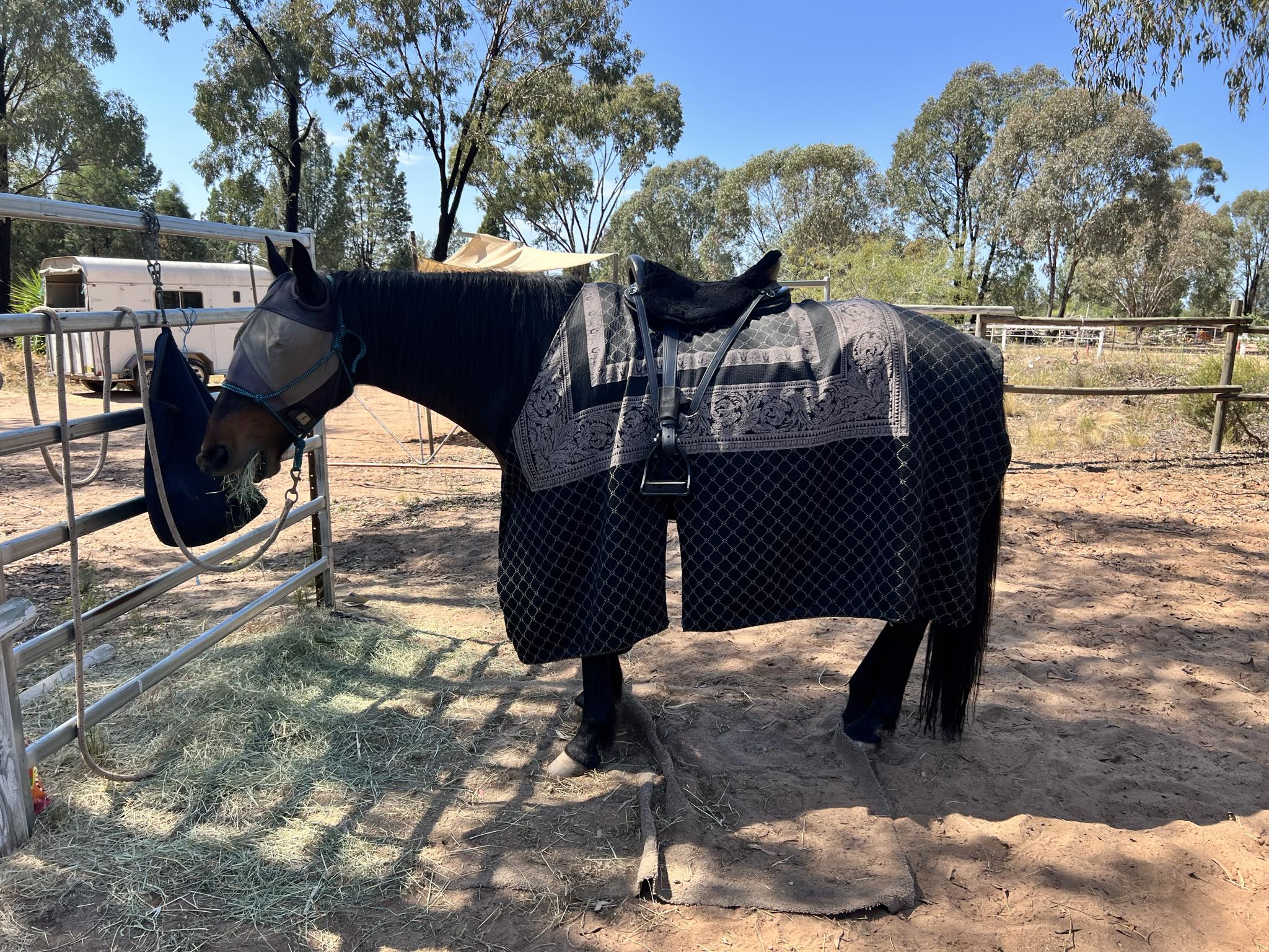 Hofbarones Katrijn van Delden has four horses on her property – three retired pacers (Standardbreds) and a cheeky mini. Currently her Standardbred Gelding, Hawkowl, is in training for a few demonstration activites at Radburne War including parade (carrying a flag), rings, obstacles and quintain.